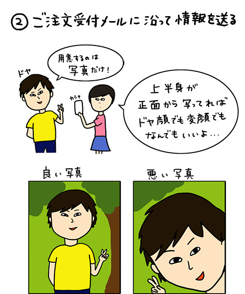 ご注文メールの内容に従って情報をご記入して、写真データ(jpeg,pngなど)を添付してメールを送信してください。