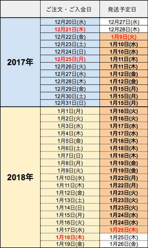 なお、1/18(木)以降のご注文に関しては、通常納期で配送させていただきます。