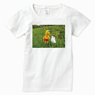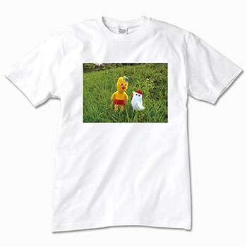 よしこととり。ふたりはお外でゆっくり散歩。なにやら楽しそう。そんな場面を写真に収めてプリントしたTシャツです。
