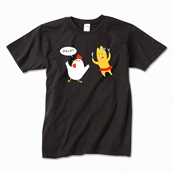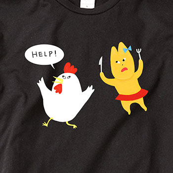 新しく書き下ろしたデザイン!たまにはケンカもする2人。よしこが怒ると「やきとりにしてやる~!」と言って、とりを追いかけまわします。そんな二人のポップな1枚をTシャツにしました。
