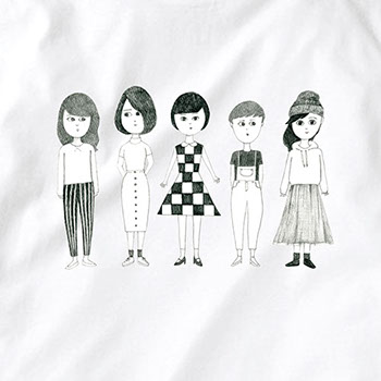 鉛筆デッサン画をプリントしました!女の子たちが横に5人並ぶシンプルなデザインながら、よく見てみるとファッションや表情が繊細に描かれています。